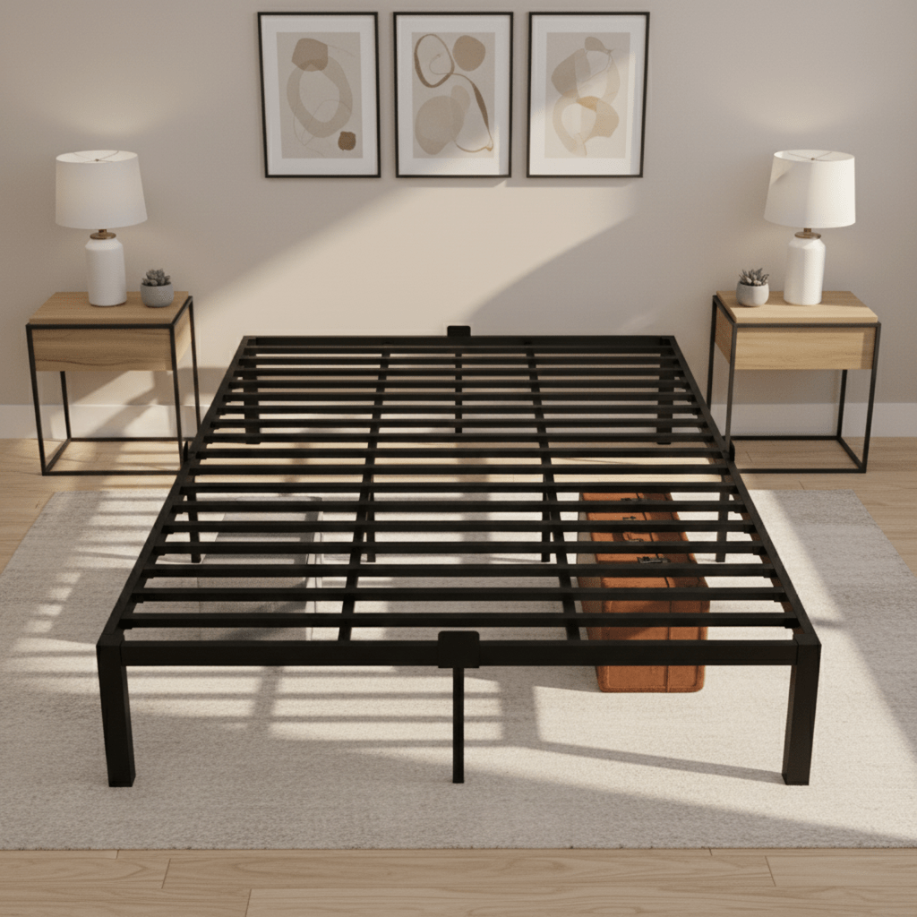 Home » Shop » Homdec Atlas Queen Size Metal Bed Frame, with Sturdy and Durable Mattress Base, Mattress Slider Stopper, No Noise, Non-Slip, Easy Assembly, Black.