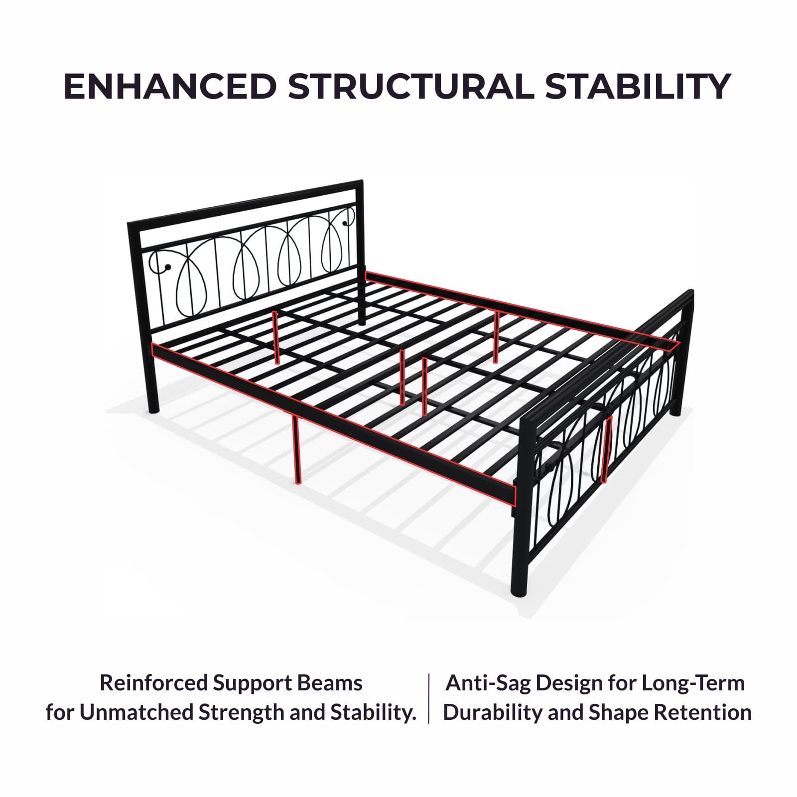 STYLISH AND ROBUST DESIGN – The Homdec Lyra Queen Size Metal Bed features a durable metal frame with a weight capacity of 250 kg, evenly distributed. Its powder-coated finish ensures both long-lasting style and strength.