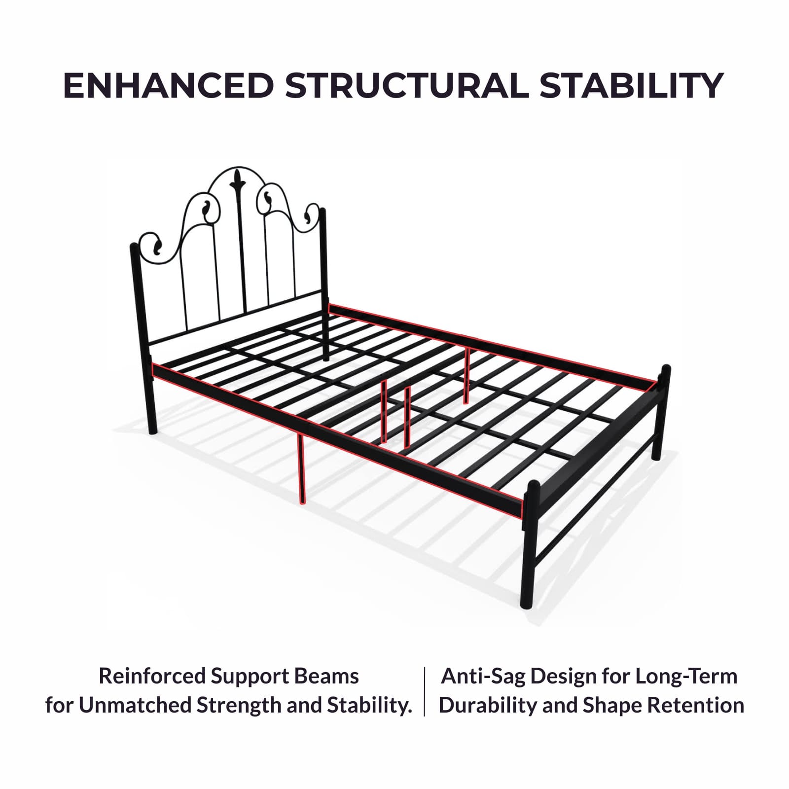 STYLISH, INNOVATIVE DESIGN – The Homdec Pavo Double Metal Bed features a robust metal frame designed to provide strong and reliable support, with a weight capacity of 200 kg, evenly distributed. Its powder-coated finish ensures a sleek and modern look that complements any bedroom decor.