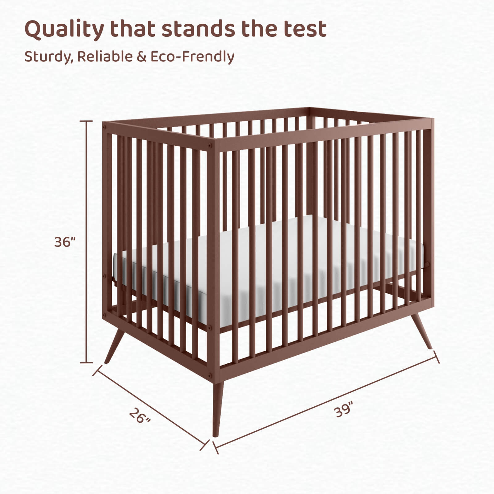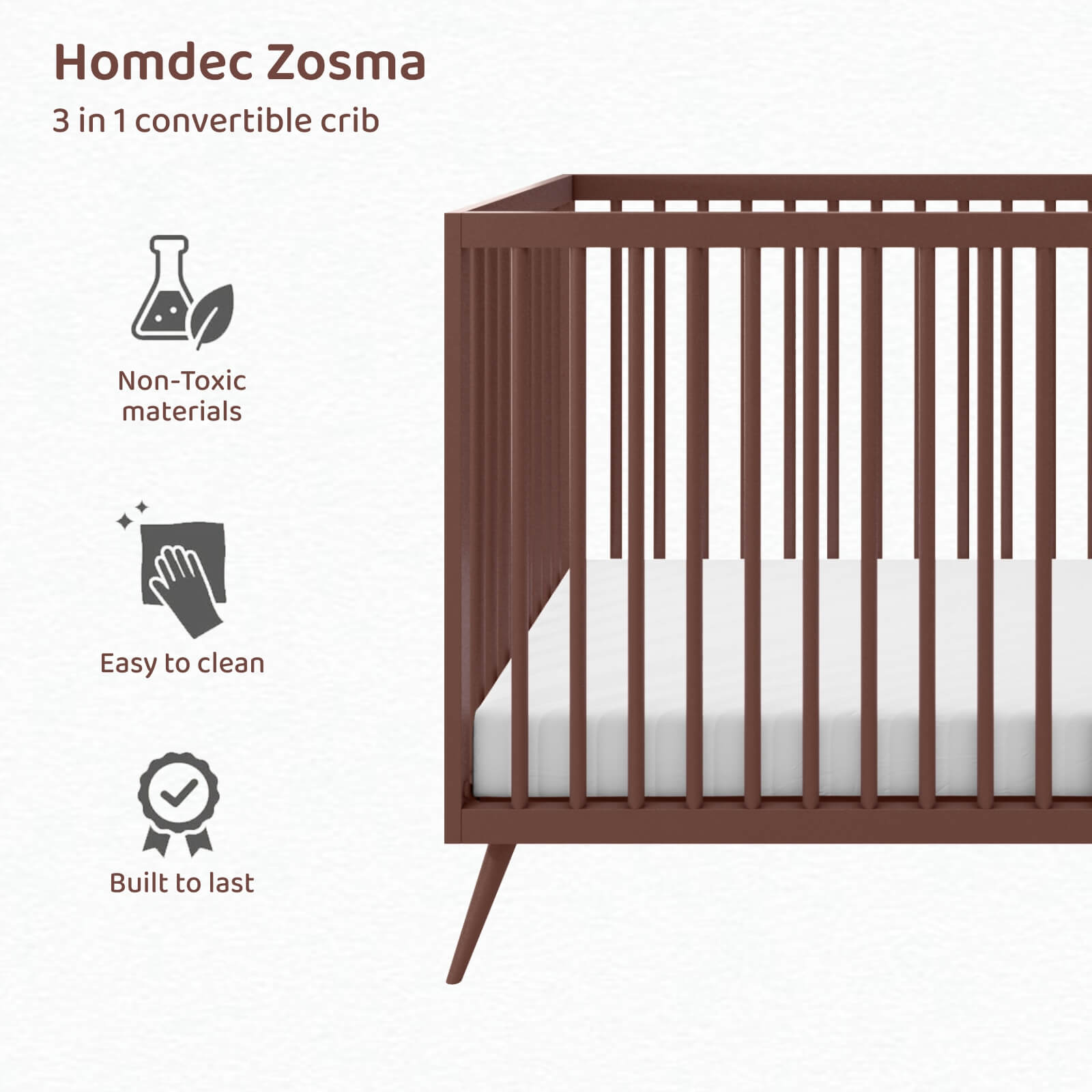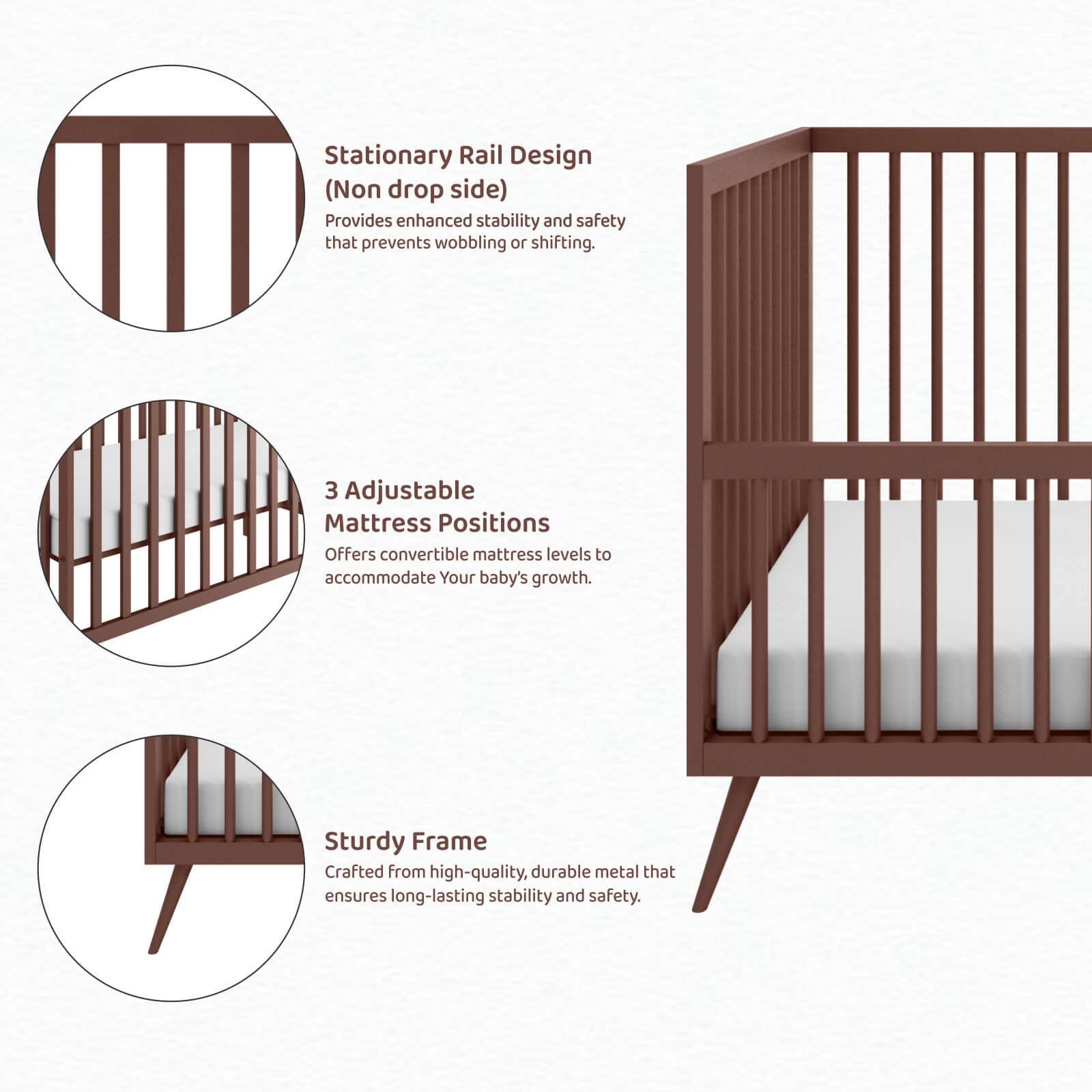 Homdec Zosma Metal Baby Crib/ Baby Cot with 3 Height Adjustable Mattress Positions (Brown)