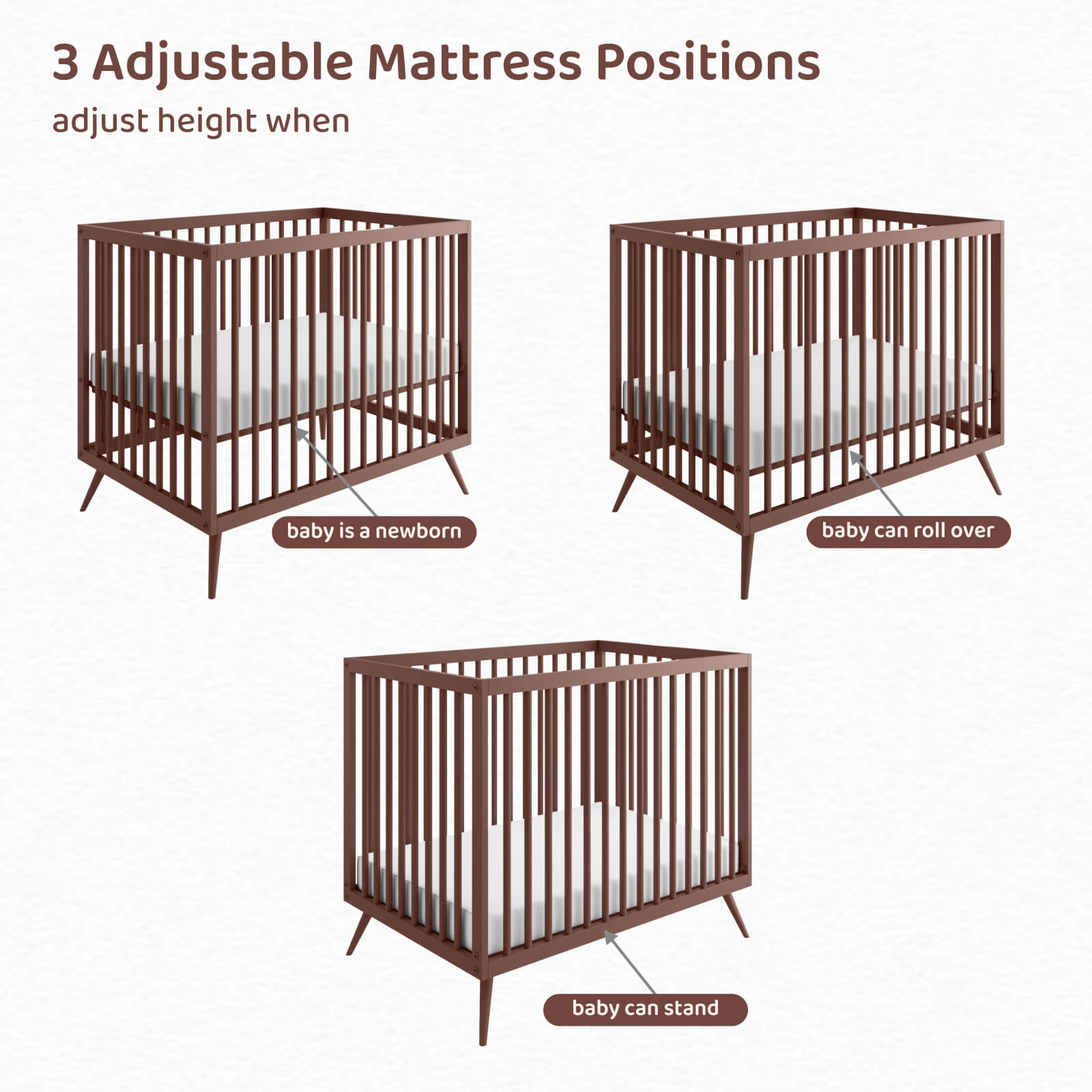 Three adjustable mattress positions that can be lowered as your baby begins to sit, pull up, and stand. |